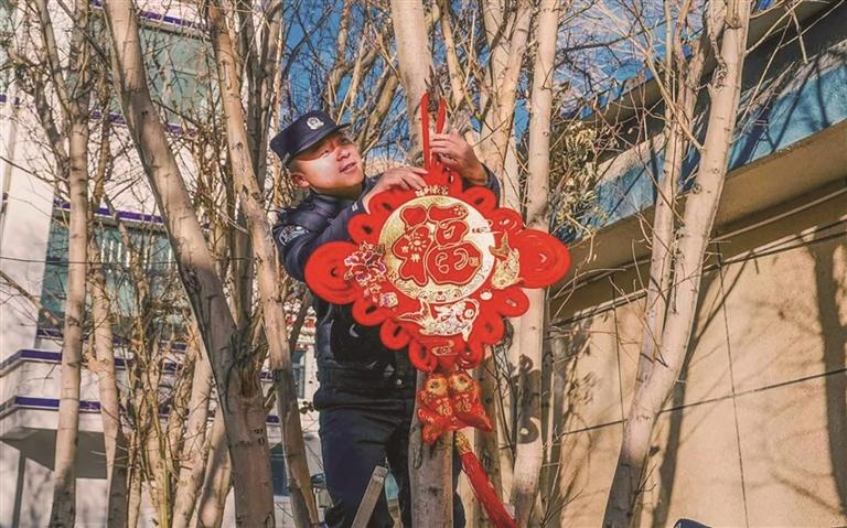 夜幕四合,一天的走访慰问与便民服务圆满结束,派出所营区里迎来了一场属于边关卫士的新春“家宴”。“来来来,搭把手!把中国结挂高点,更显喜庆!”教导员杨曦淙踩着凳子悬挂中国结,新警吴措多杰在一旁稳稳扶着梯子;另一边,民警们三五成群,贴春联、挂彩灯,将营区装点得喜气洋洋、年味十足。